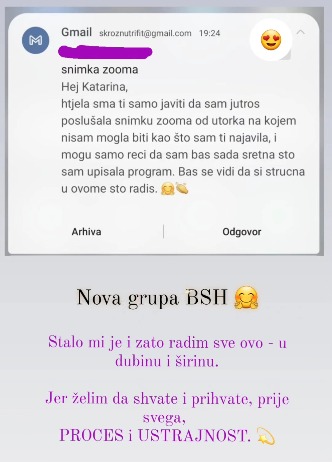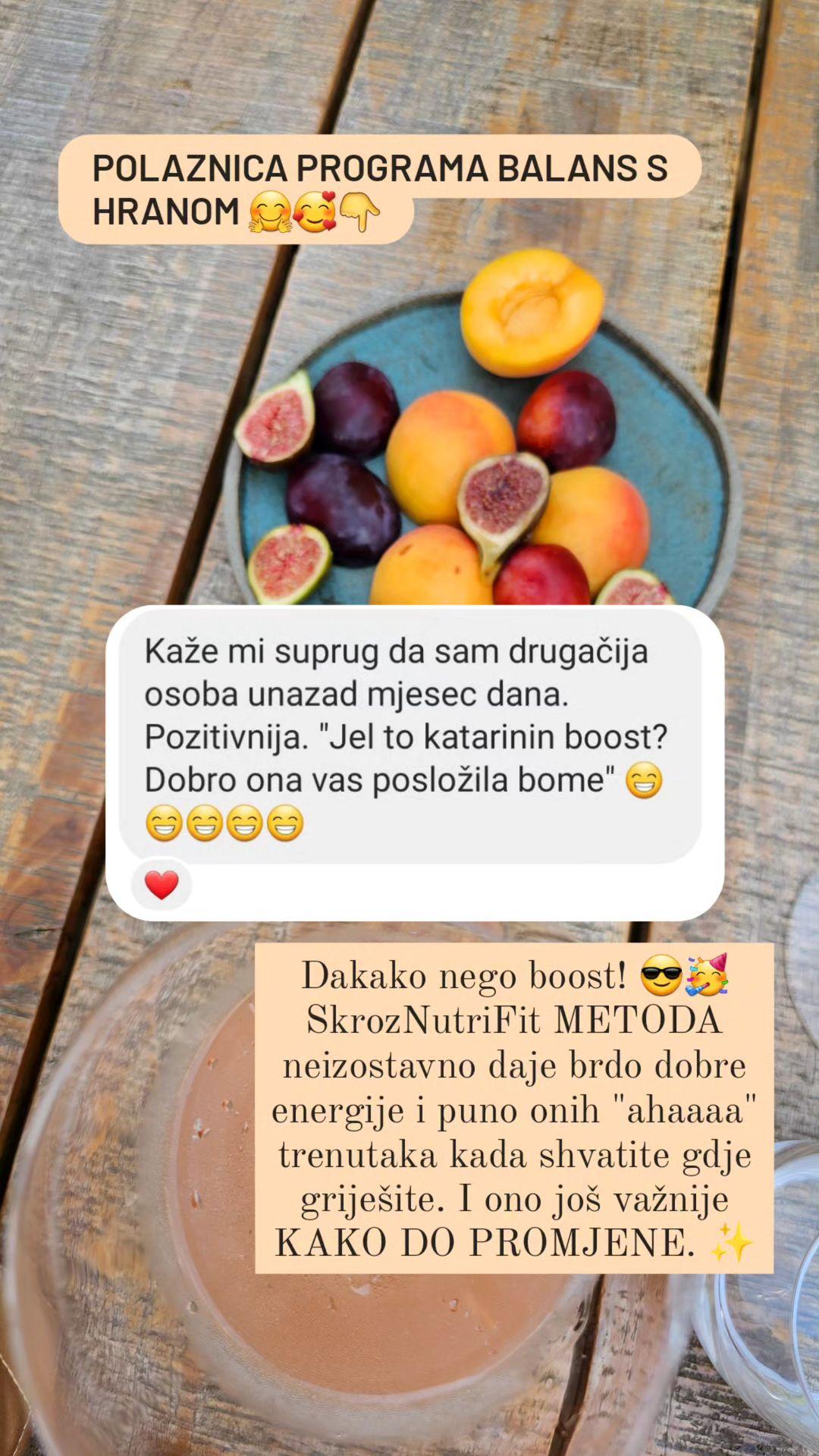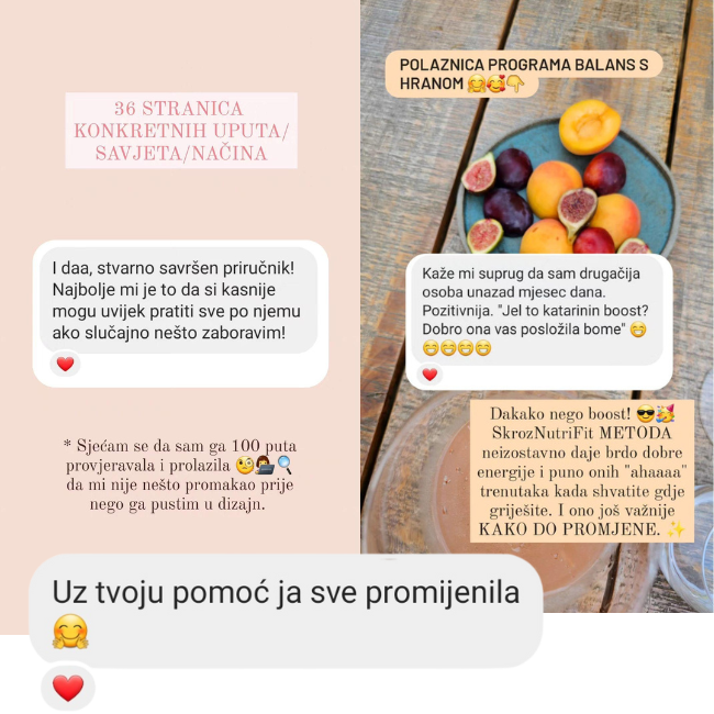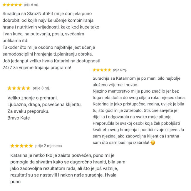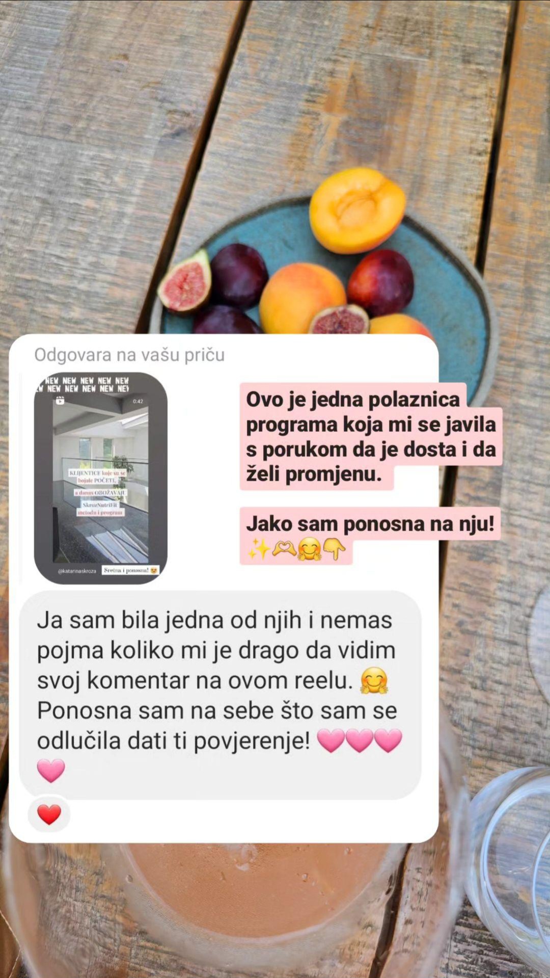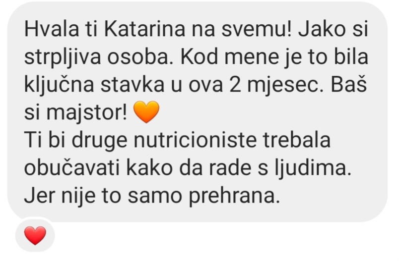"Nakon nekog vremena imam veliku potrebu zahvaliti se svojoj savjetnici za prehranu, Katarini Skrozi uz koju već godinu dana svakodnevno učim i primjenjujem naučeno u svakodnevnom životu. Većinu svog života vježbam, ali kad je u pitanju prehrana dosta sam griješila. Uz Katarinu moj odnos prema hrani se potpuno promjenio i više nemam grižnju savjest dok jedem jer točno znam što radim. Naučila sam što znači balans u prehrani i promijenila svoj mindset. Hvala ti što si uvijek bila spremna pomoći i što si uvijek tu kad te trebam."