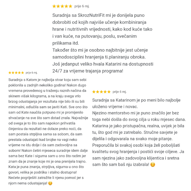 Više od 300 klijenata uspješno je prošlo kroz suradnju sa mnom, i uspjelo skinuti suvišne kilograme i promijeniti prehrambene navike.