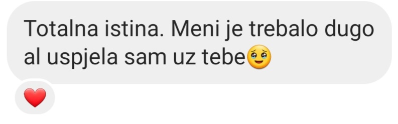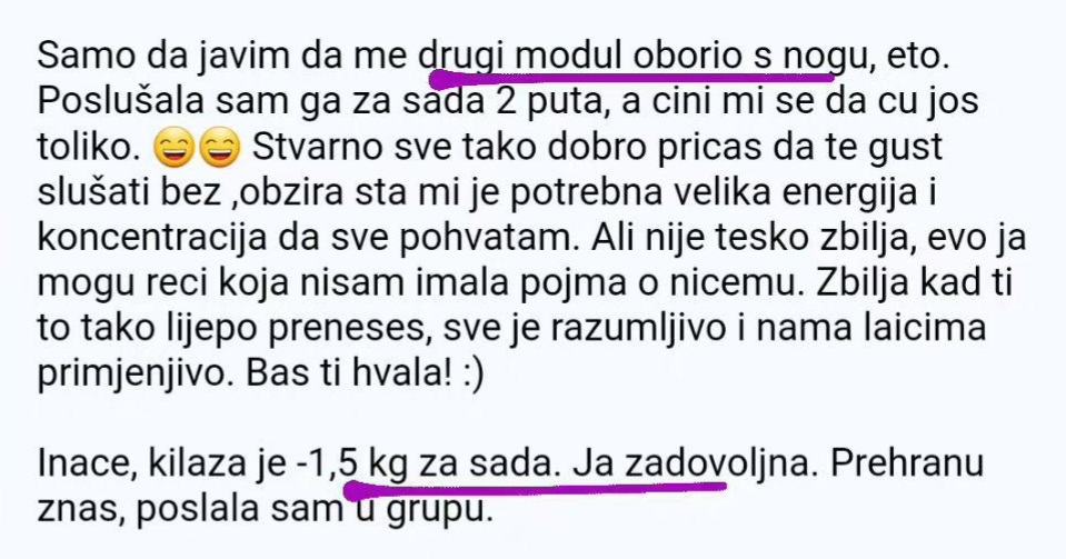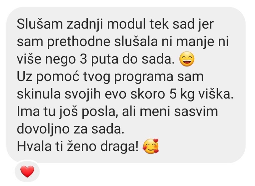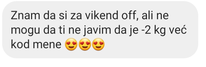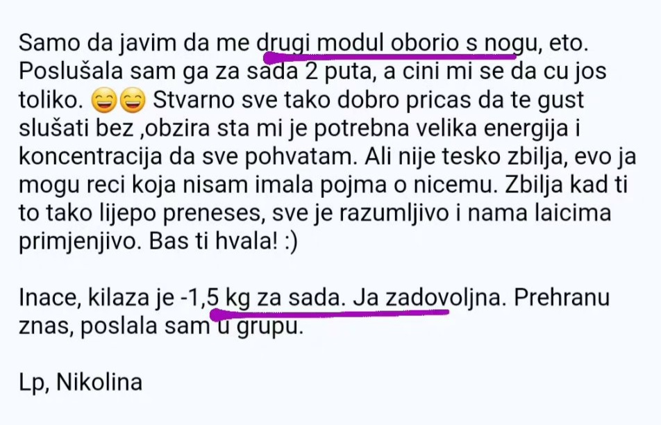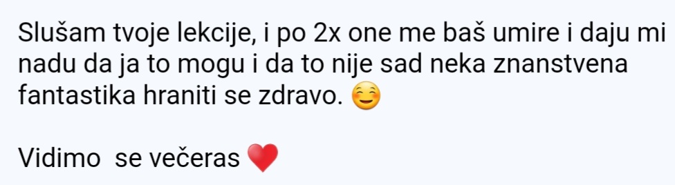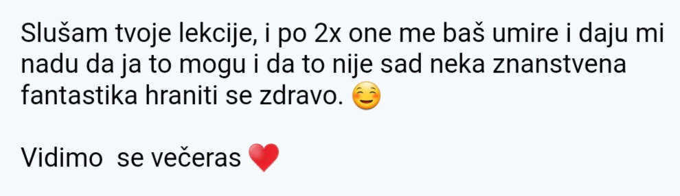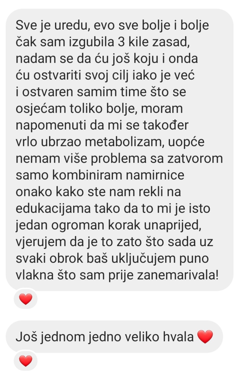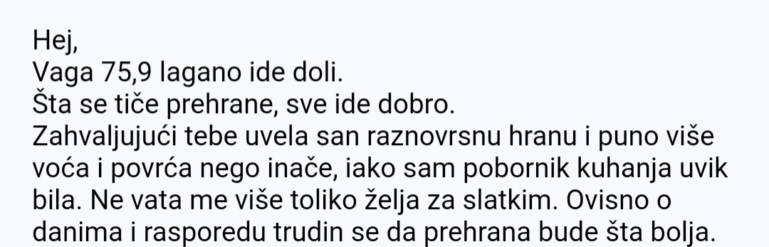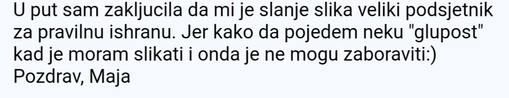 "Motivacija koju si potakla i podgrijavala dovela me do ovoga danas. Lakša sam za 17 kg. Svaki početak je težak al ovaj zaista nije bio jer je uz tvoje upute bilo zaista lako "marširati" naprid onako junački generalski prema zadanom cilju. Iman samo velike riči zahvale i hvale, možda si mi i "spasila" život jer sama se nisam mogla pokrenuti ni krenuti. Hvala ti na svemu ,naravno da ću tražiti savjet i "držati" se tebe u svemu nejasnom al objasnila si ti puno toga. Javljam se naravno sa novim "uspjesima". Šaljem puno ljubaca i želim puno uspjeha u pomoći ljudima koji je trebaju."