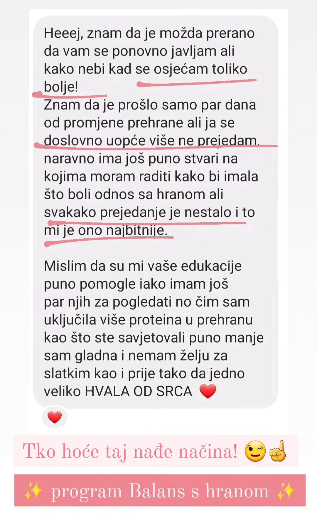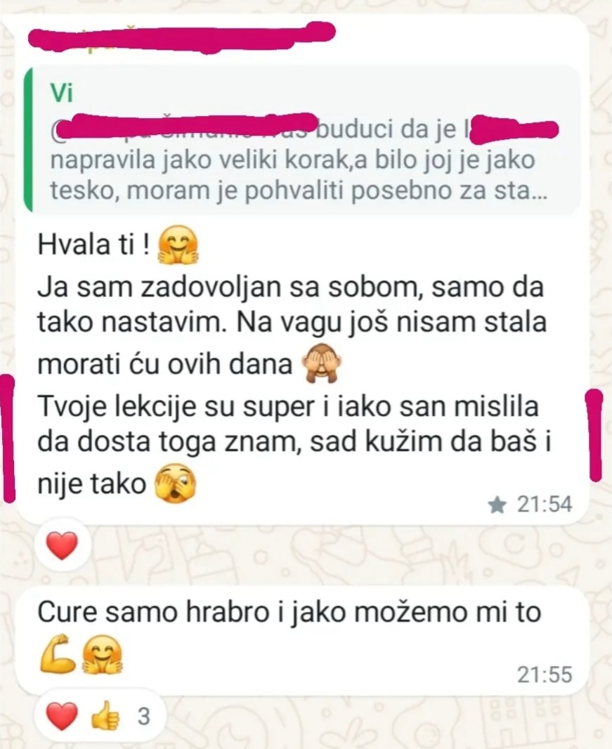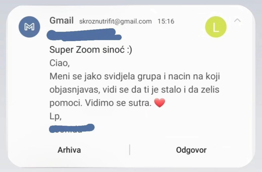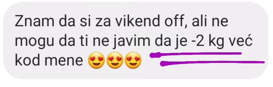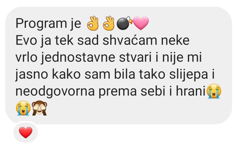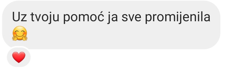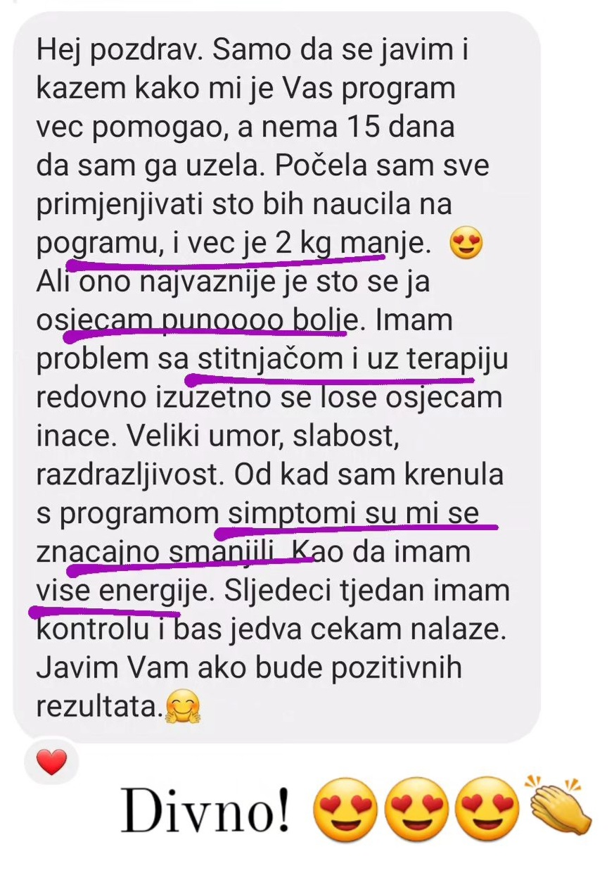 "Motivacija koju si potakla i podgrijavala dovela me do ovoga danas. Lakša sam za 17 kg. Svaki početak je težak al ovaj zaista nije bio jer je uz tvoje upute bilo zaista lako "marširati" naprid onako junački generalski prema zadanom cilju. Iman samo velike riči zahvale i hvale, možda si mi i "spasila" život jer sama se nisam mogla pokrenuti ni krenuti. Hvala ti na svemu ,naravno da ću tražiti savjet i "držati" se tebe u svemu nejasnom al objasnila si ti puno toga. Javljam se naravno sa novim "uspjesima". Šaljem puno ljubaca i želim puno uspjeha u pomoći ljudima koji je trebaju."