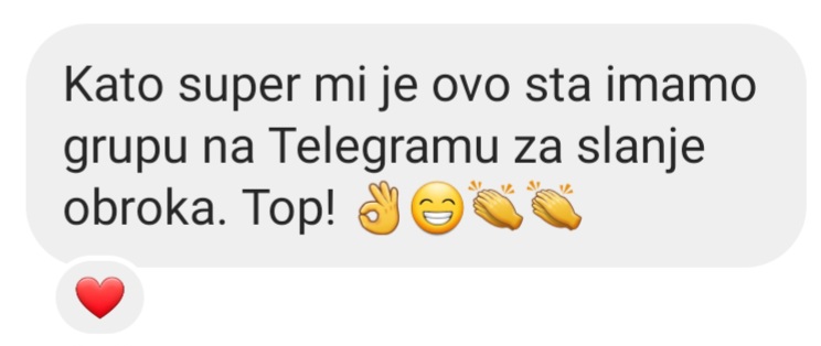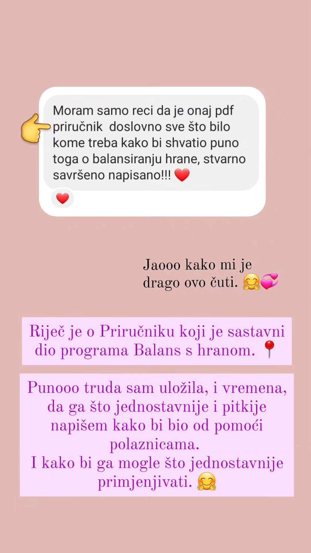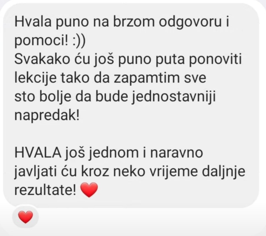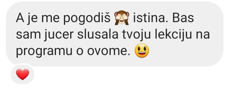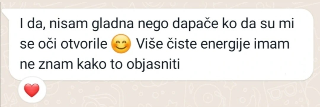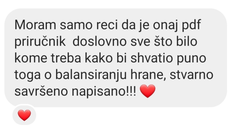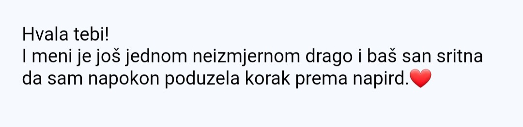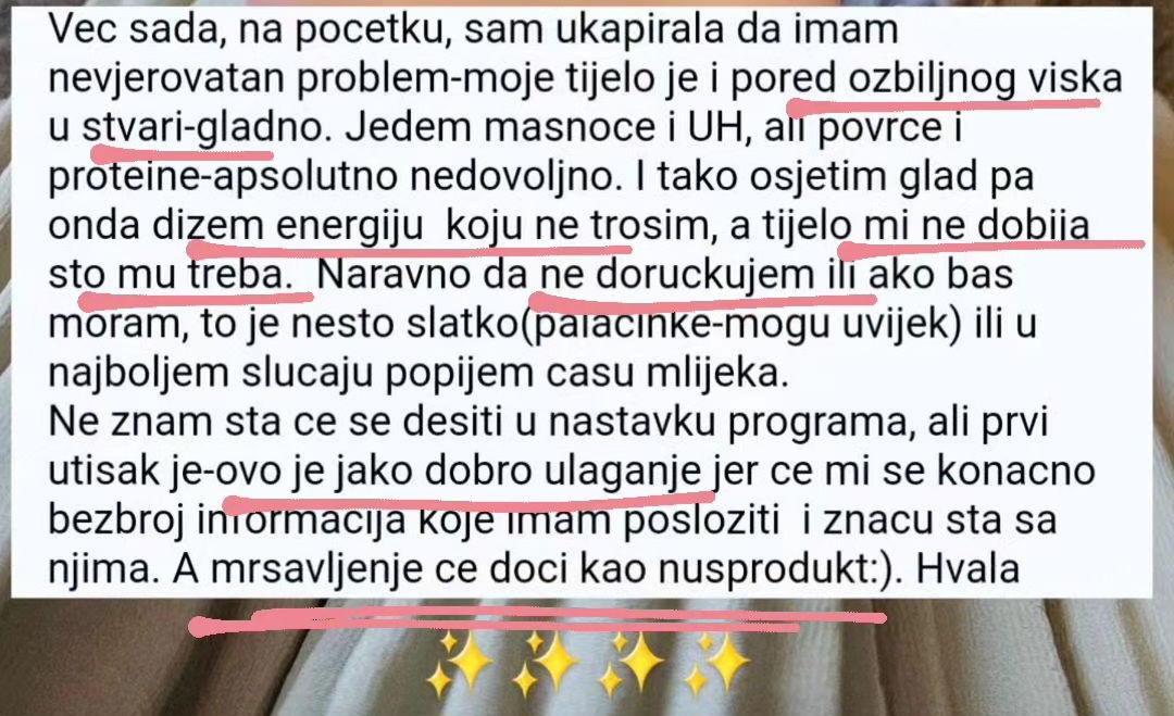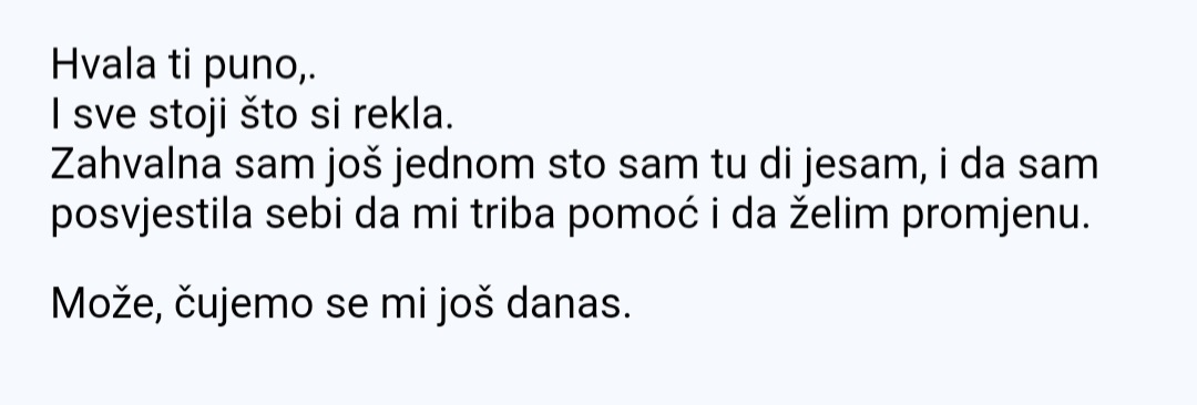"Motivacija koju si potakla i podgrijavala dovela me do ovoga danas. Lakša sam za 17 kg. Svaki početak je težak al ovaj zaista nije bio jer je uz tvoje upute bilo zaista lako "marširati" naprid onako junački generalski prema zadanom cilju. Iman samo velike riči zahvale i hvale, možda si mi i "spasila" život jer sama se nisam mogla pokrenuti ni krenuti. Hvala ti na svemu ,naravno da ću tražiti savjet i "držati" se tebe u svemu nejasnom al objasnila si ti puno toga. Javljam se naravno sa novim "uspjesima". Šaljem puno ljubaca i želim puno uspjeha u pomoći ljudima koji je trebaju."
