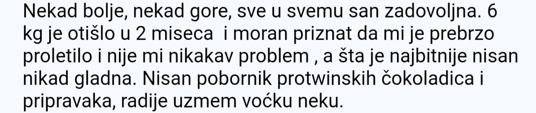 "Uz Katarinu, u mjesec i pol dana uspjela sam skinuti 5 kg. Prezadovoljna sam. Nekako ne mogu vjerovati da jedem i da mršavim. Onako - ja jedem! Konačno. Tako mi je drago da sam uspjela prevazići svoju prvotnu skeptičnost. Preporučam ju svima."