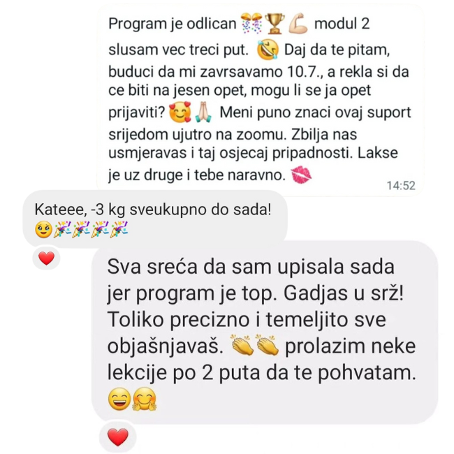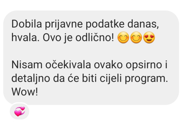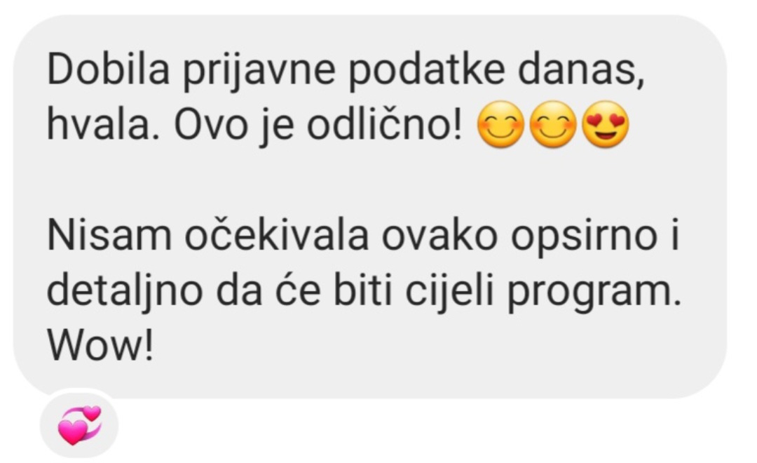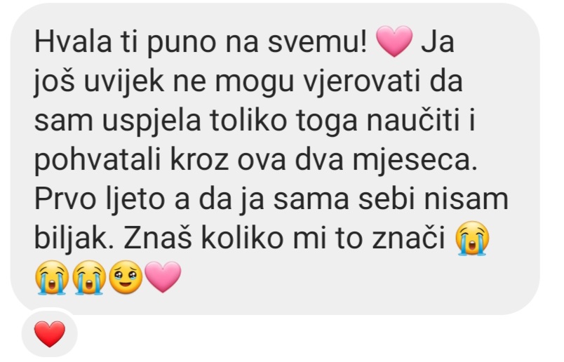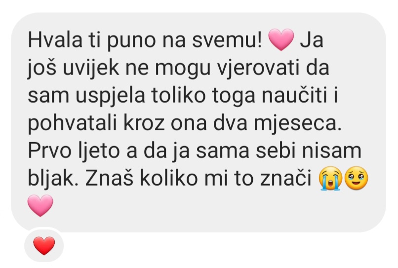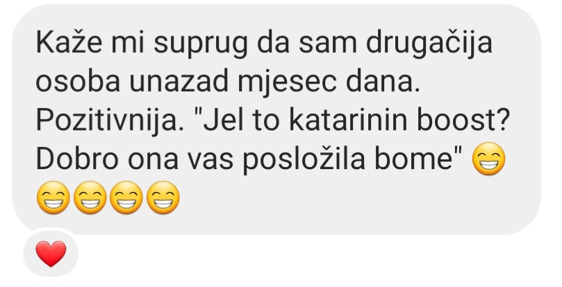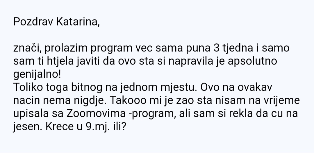 "Katarina mi je pružila znanje, motivaciju i neiscrpnu podršku. Sretna sam i ispunjena i drago mi je što sam upoznala katu i što sam imala priliku podružitit se s tako snažnom ženom. Riješila sam se svih stresnih stvari i hvala joj puno na tome!"