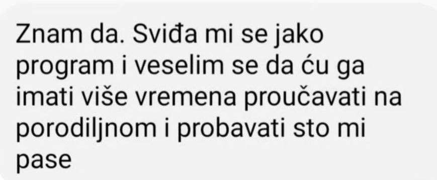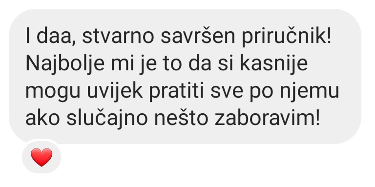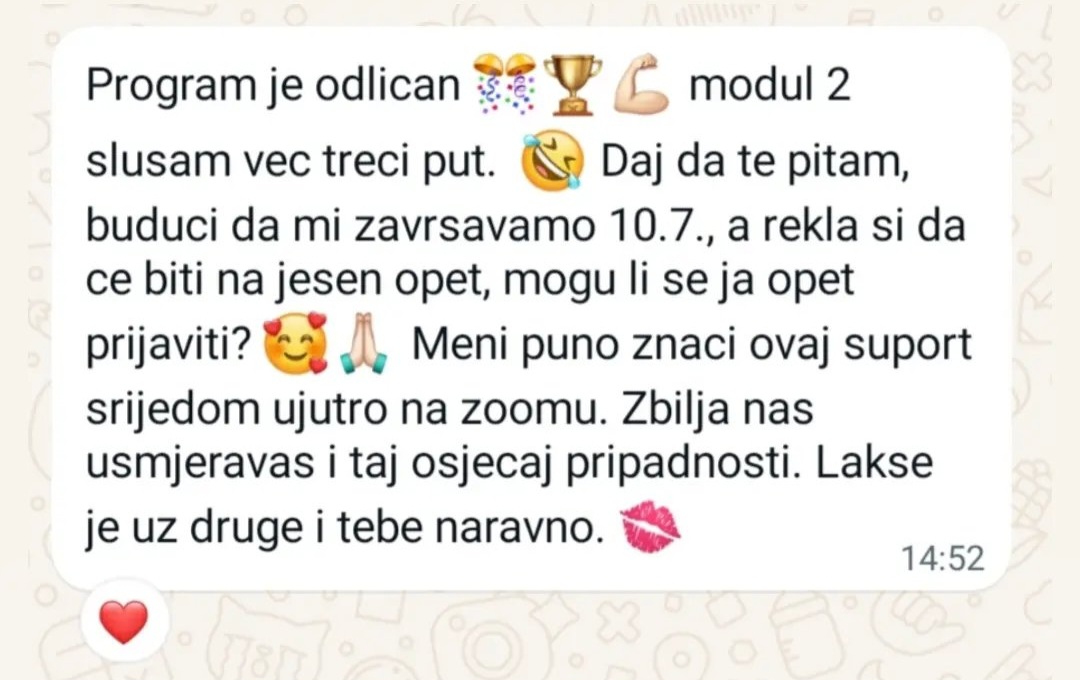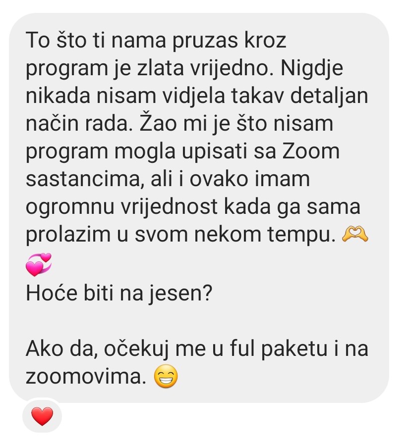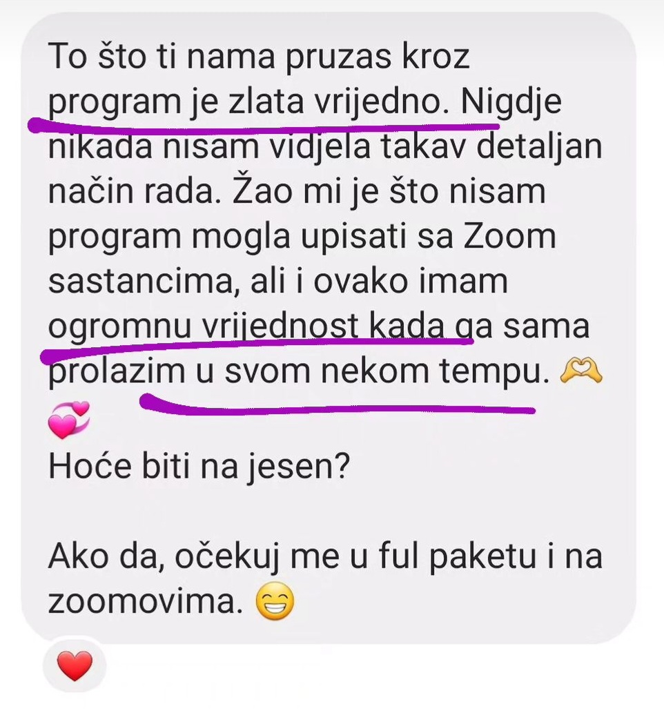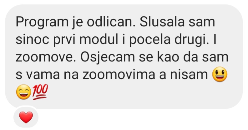 "Katarina mi je pružila znanje, motivaciju i neiscrpnu podršku. Sretna sam i ispunjena i drago mi je što sam upoznala katu i što sam imala priliku podružitit se s tako snažnom ženom. Riješila sam se svih stresnih stvari i hvala joj puno na tome!"