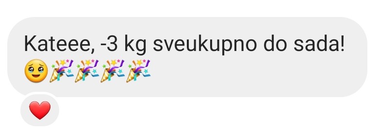 "Vaga je jutros pokazala 90,9 kg što je točno - 8 kg u navedenom periodu. Tijekom suradnje s Katarinom, u situacijama emotivnih kriza naleti prejadanja nisu vodili ni blizu onakvom prejedanju koje me dovelo do 100 kg i odustajanja. Brzo sam se svaki put iznova vratila na pravi put uravnotežene prehrane - prehrane u kojoj nema "loše i zabranjene hrane" već sve hrane koja u pravim kombinacijama i pravim omjerima nosi rezultat i cilj - skinit napucane kilograme. Znači bilo je dana kad sam pod normalno jela pizzu, kolače, palačinke, ali u pravoj mjeri i u pravo doba dana i vaga bi svejedno išla u minus. I to sve zbog toga jer mi je Katarina dala prave upute i objasnila mi kako stvari funkcioniraju. Katarina se u potpunosti posveti svom klijentu, uvijek je dostupna, profesionalna i u svemu tome topla podrška jer zbog svog osobnog iskustva i sama razumije da nije lako i da neće ići preko noći. Puno mi je značilo što nisam imala osjećaj da me samo "odrađuje", već me doživljavala u potpunosti."