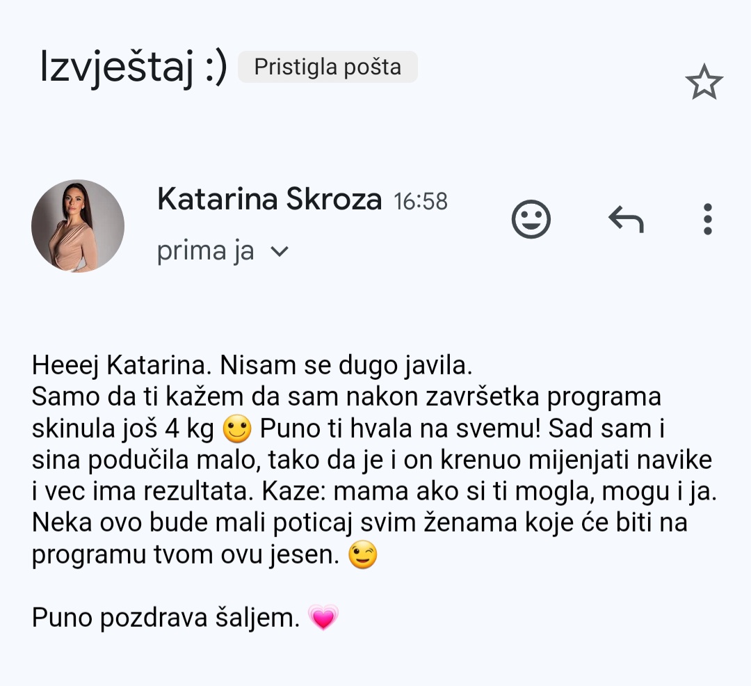 "Katarini prije svega dugujem jedno veliko hvala na pomoći pri skidanju kilograma, na usluzi i i dostupnosti kad god sam trebala novi savjet. Pogotovo hvala za razne recepte i veliku nesebičnost. Ja sam zadovoljna, sve je u glavi. Ostali dio posla, vezan uz vježbanje za trbuh, jačanje mišića nogu i leđa ću postepeno uz prehranu uvoditi."